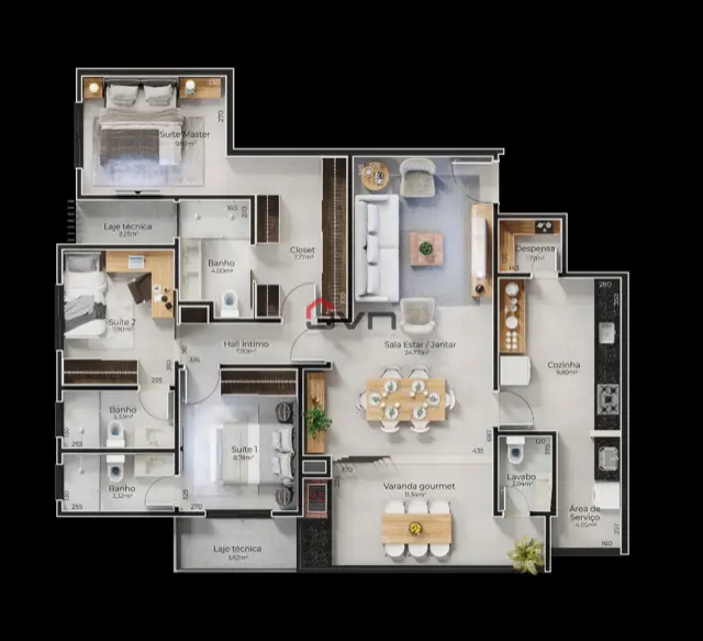 Com 3 quartos sendo uma suíte e 2 semi-suites e varanda gourmet. O apartamento conta com lavabo, dispensa e 2 vagas de garagem.