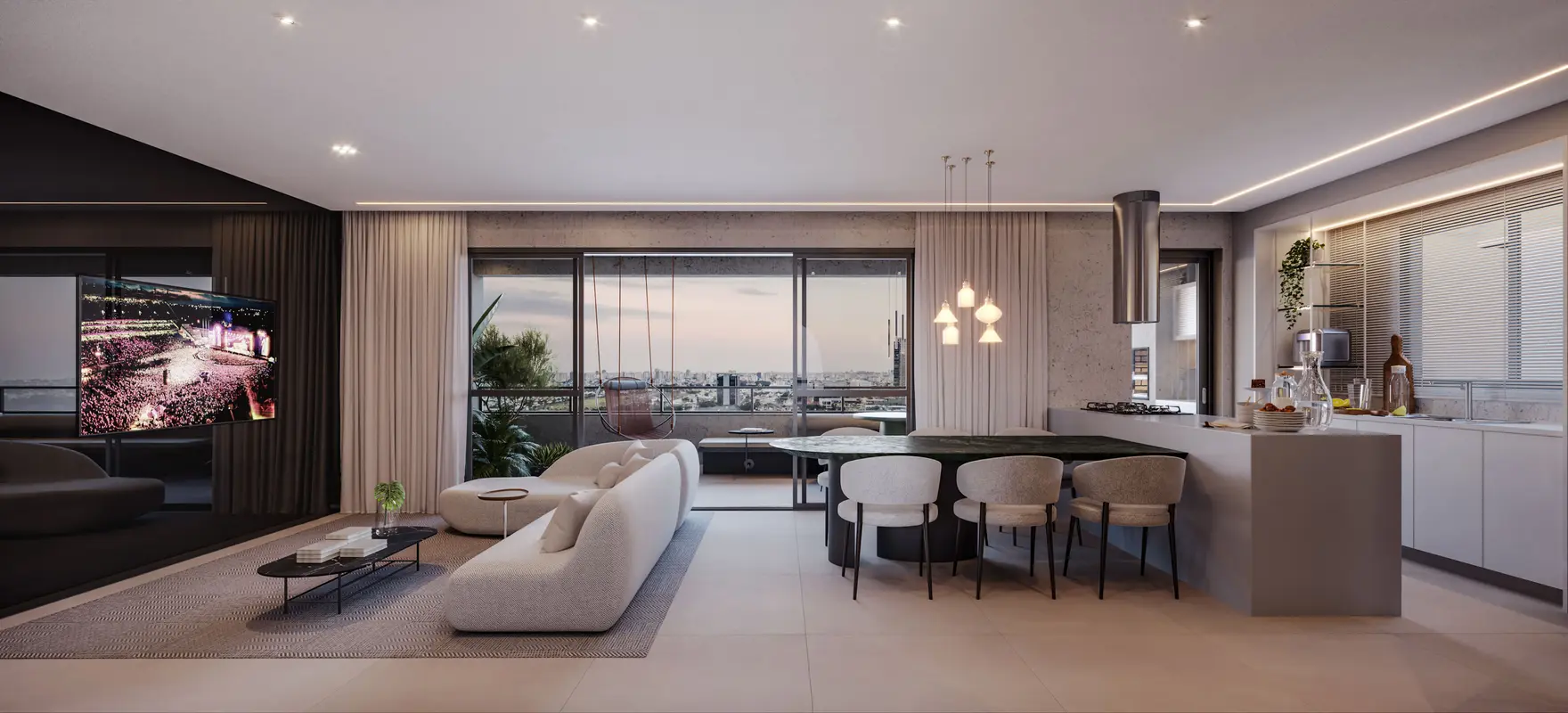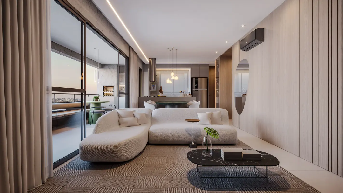 Luxuoso apartamento de alto padrão com 4 suítes, amplas salas de estar e jantar, cozinha moderna, varanda gourmet e 2 vagas de garagem.