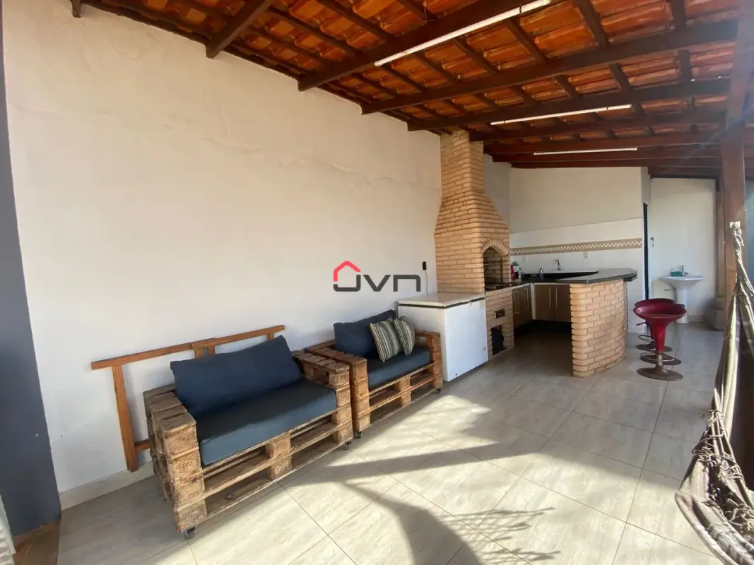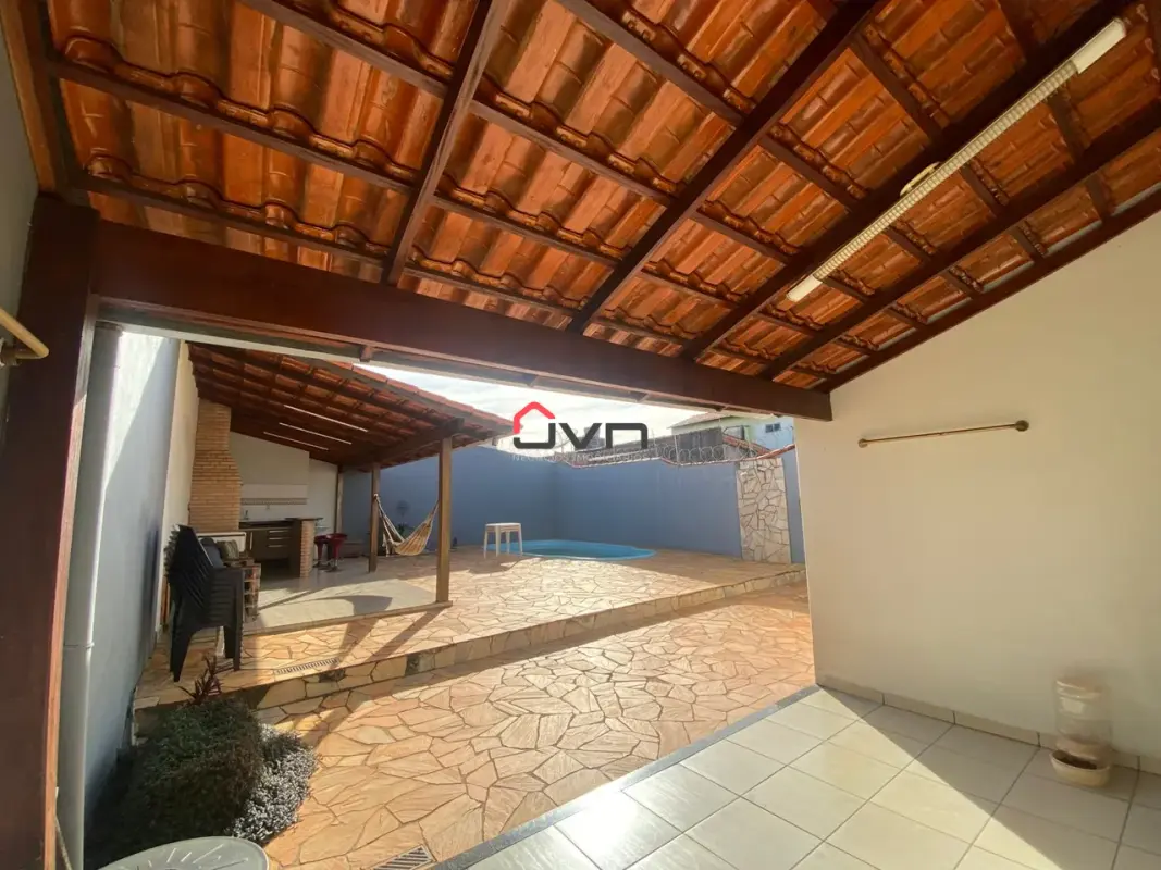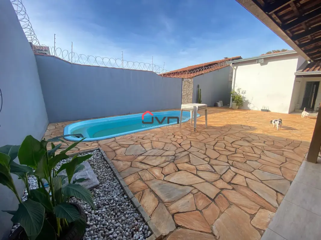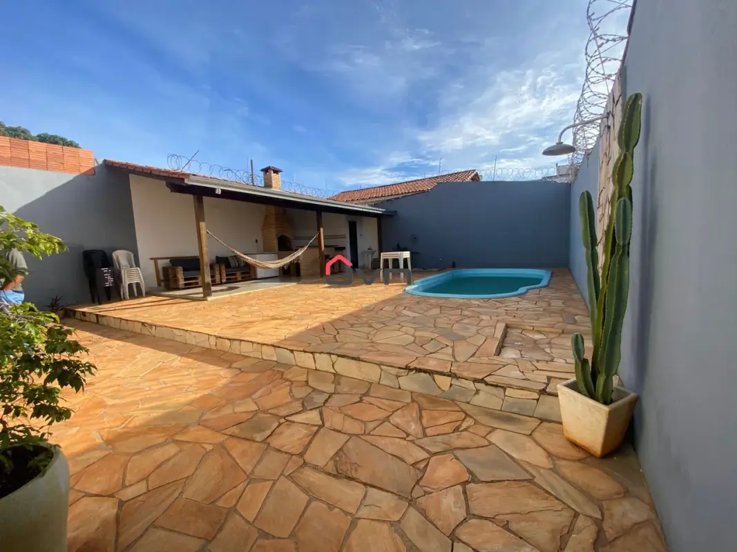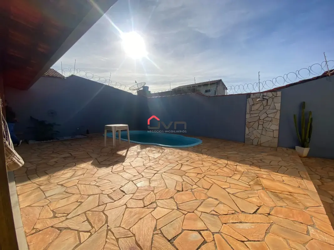 Casa com ampla área de lazer, três quartos, copa cozinha, sala, banheiro, área de serviço, área de lazer completa, com piscina, churrasqueira e banheiro, garagem para 4 carros.