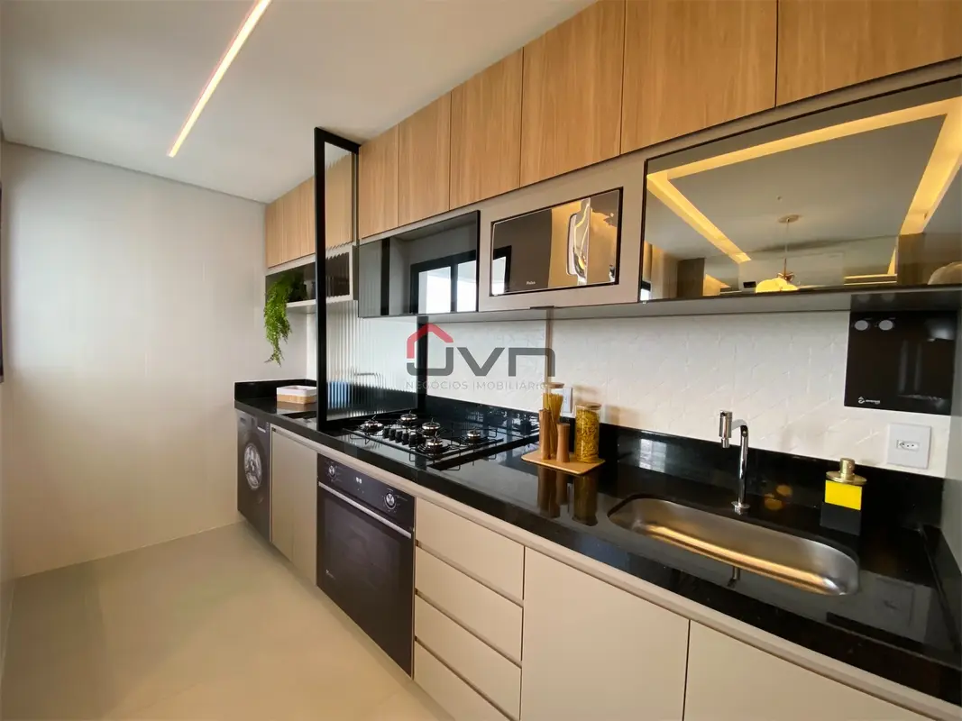 Condomínio com elevador, piscina, academia, salão de festas, espaço convivência, deck molhado e seco, churrasqueira, portaria.