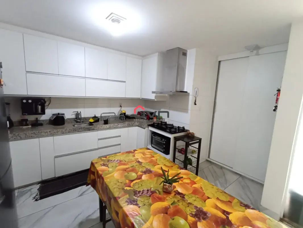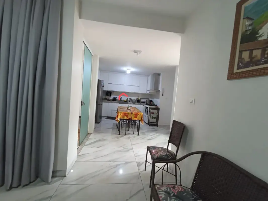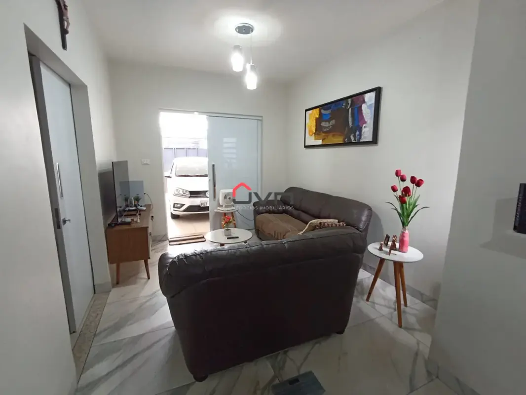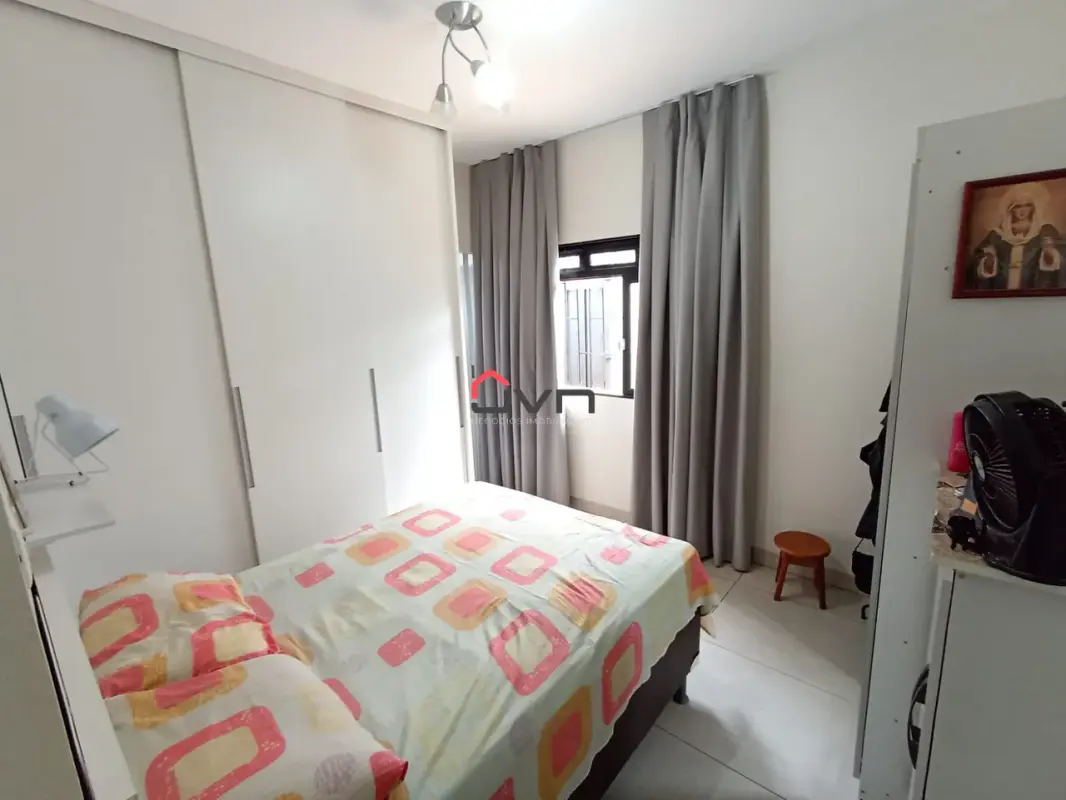 3 quartos sendo um suite, sala em dois ambientes, banheiro social, cozinha, área de serviço e duas vagas de garagem.